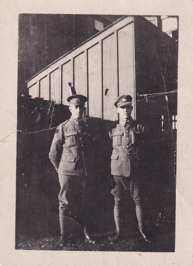 Upon the dissolution of the 135th Battalion in October 1916, Murray and possibly Bob sent home insignia from their former unit. Writing to Bob and Carrie’s mother, Fleda, from Witley Camp, Surrey, England on October 14th 1916, Murray said “I am enclosing a 135th enameled badge for you. For if I remember right you haven’t got one. Well I guess I will have to close this note as Bob is waiting to post it. Best love to you and Mr. Leach”. He is not referring here to the shoulder bars that remain in the collection, but to the sort of badge that he wears on his cap or collars in the portrait below.