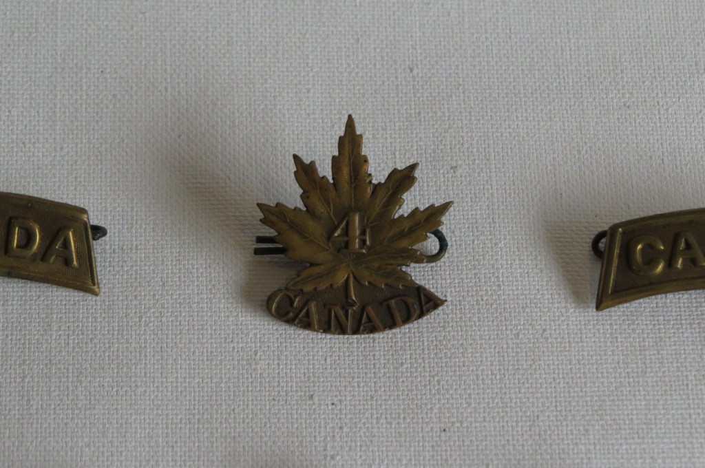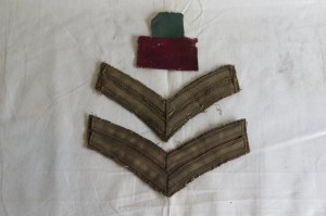 In addition to Murray’s badges and stripes, two coloured shoulder patches remain in the collection from 4th Battalion, 1st Brigade, 1st Division. The smaller green square signifiies the 4th Battalion, while the red rectangle patch belongs to the 1st Division.