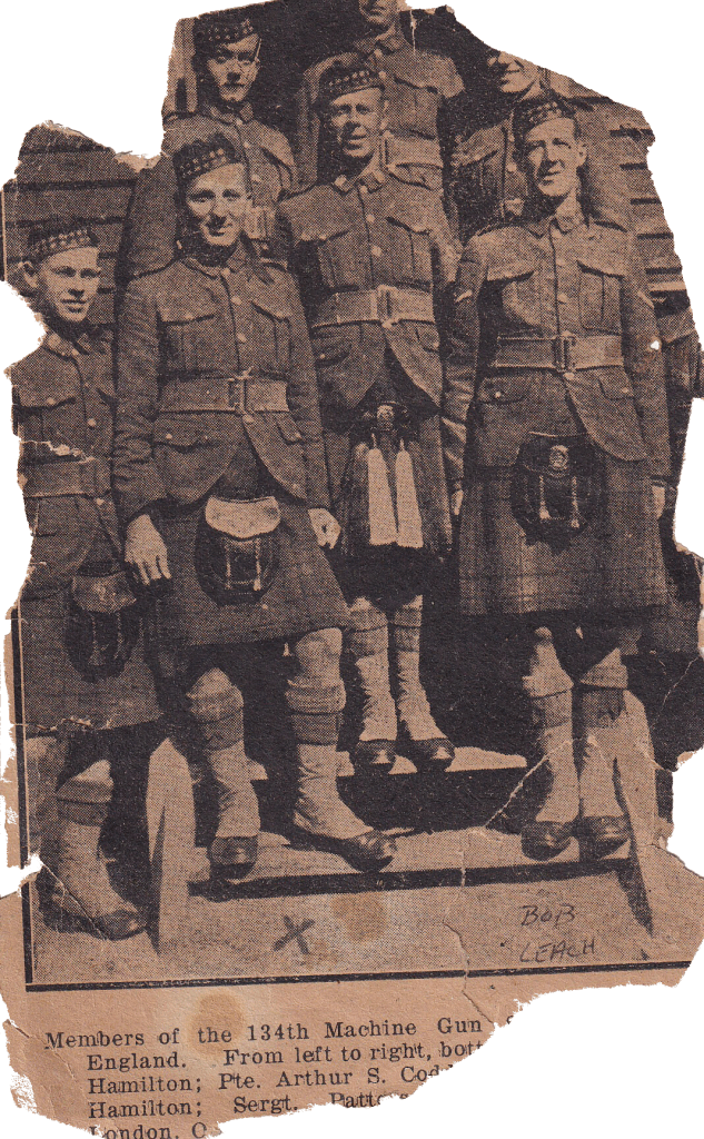 Bob and Murray were transferred to the 134th Battalion, 48th Highlander’s Regiment, on October 14th, 1916. They remained with the unit in England until February 28th, 1918, acting as instructors for much of that time. Before proceeding to France, Bob sent home some 134th Battalion insignia with a letter dated February 20th, 1918. “I sent two Glens, 2 sets of collar badges, etc. Please give Tommy one lot”. Glen is short for Glengarry, the traditional caps worn by the Scottish-Canadian unit, and Tommy was Bob’s pet name for his fiancé, Annabel Legg.